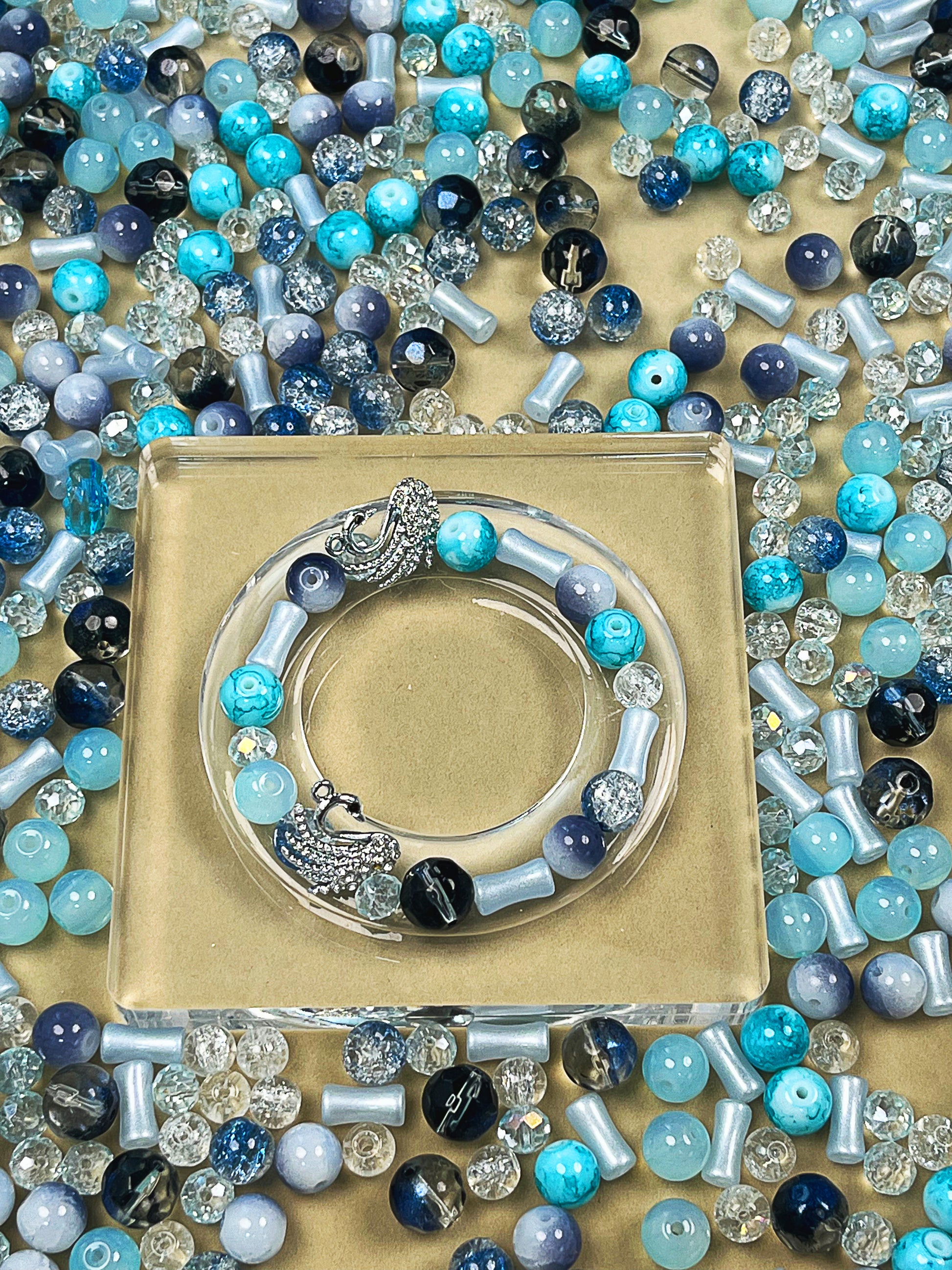 Transparente Facettenperlen erinnern an gefrorene Tropfen, hellblaue Elemente an glitzernden Tau auf Federkielen. Tiefere Blau- und Schwarznuancen verleihen dem Gesamtbild Tiefe und Kontrast – wie Schatten unter Wasser, durchzogen von Licht.