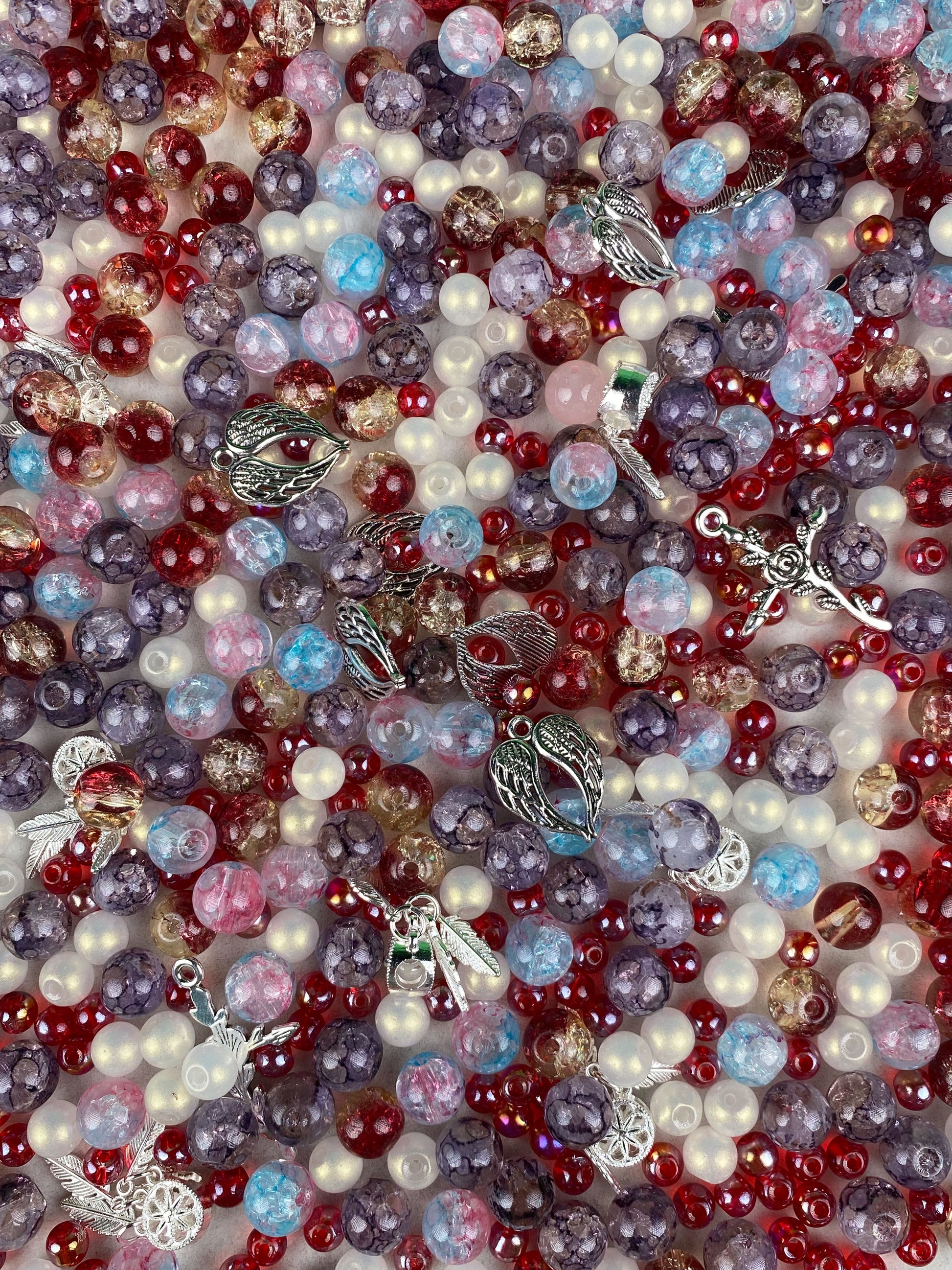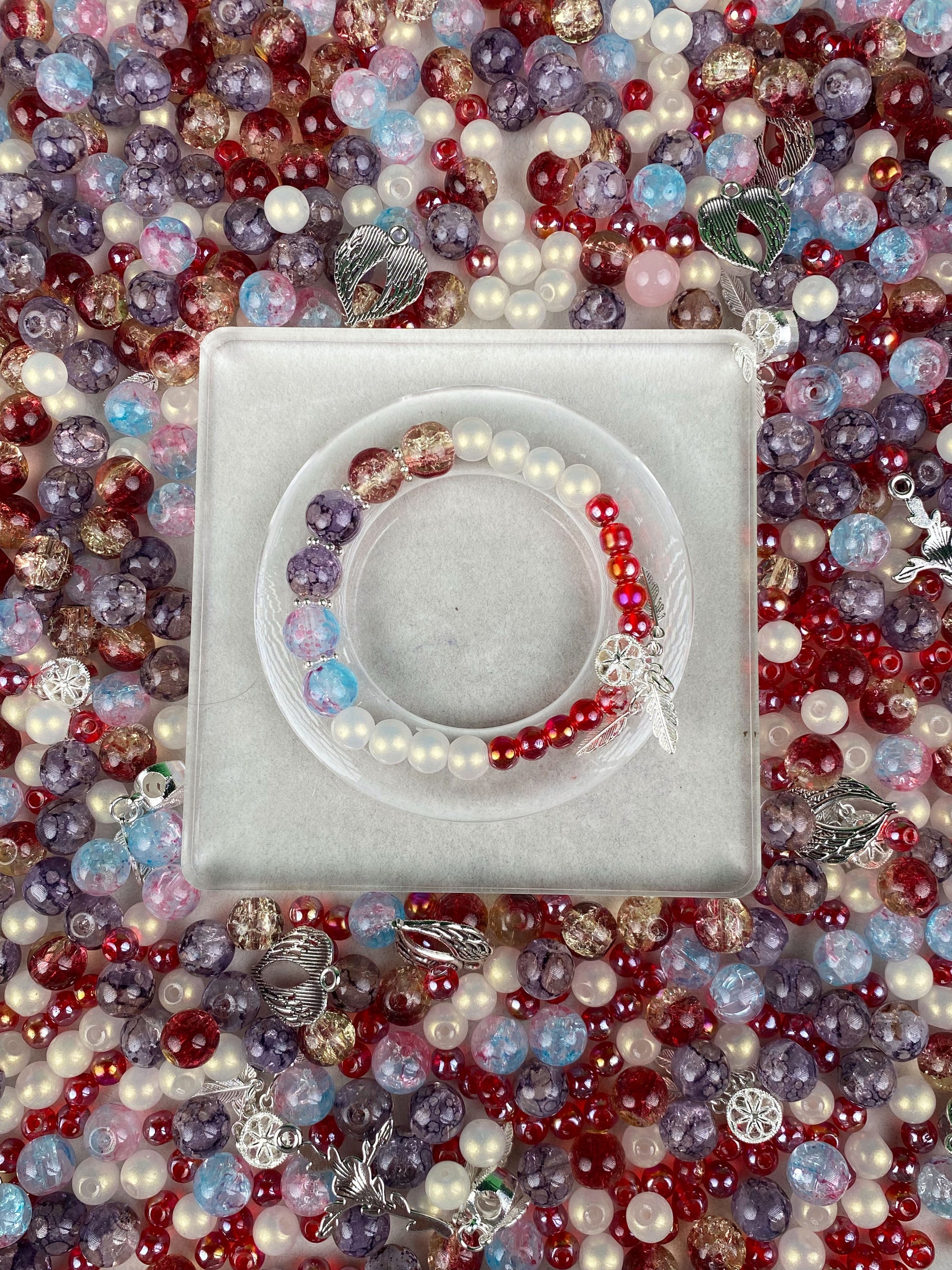 Bunte Perlen in Rot, Blau, Violett und funkelnde Details treffen auf filigrane Rosen- und Schmetterlingsanhänger.