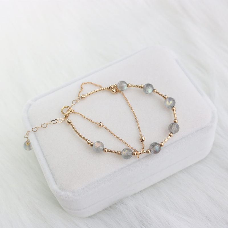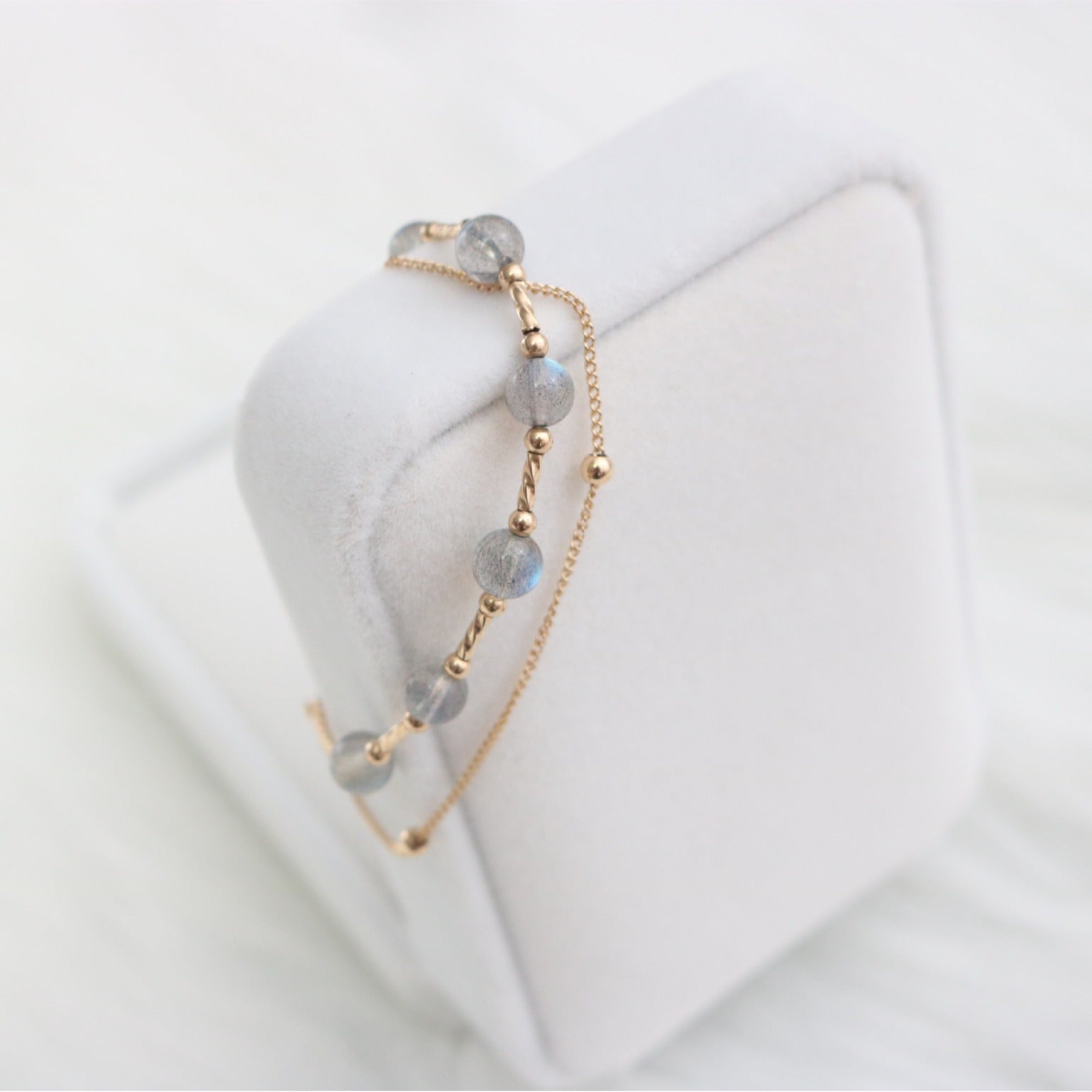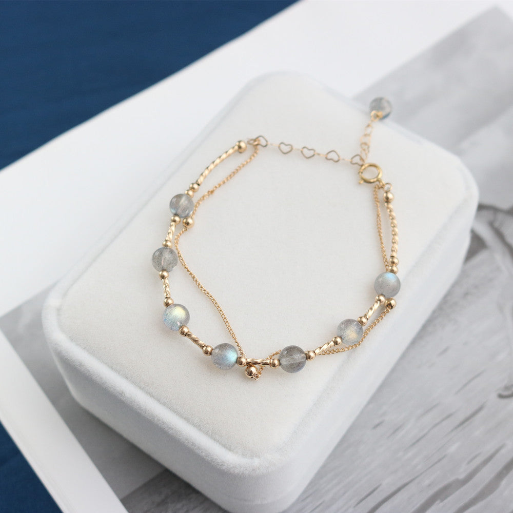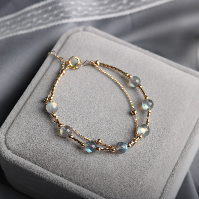 This elegant double-layered bracelet features natural moonstone beads paired with luminous crystals, bringing together intuition and clarity in one radiant piece. Known for its calming energy and connection to the divine feminine, moonstone is said to balance emotions and enhance inner vision.